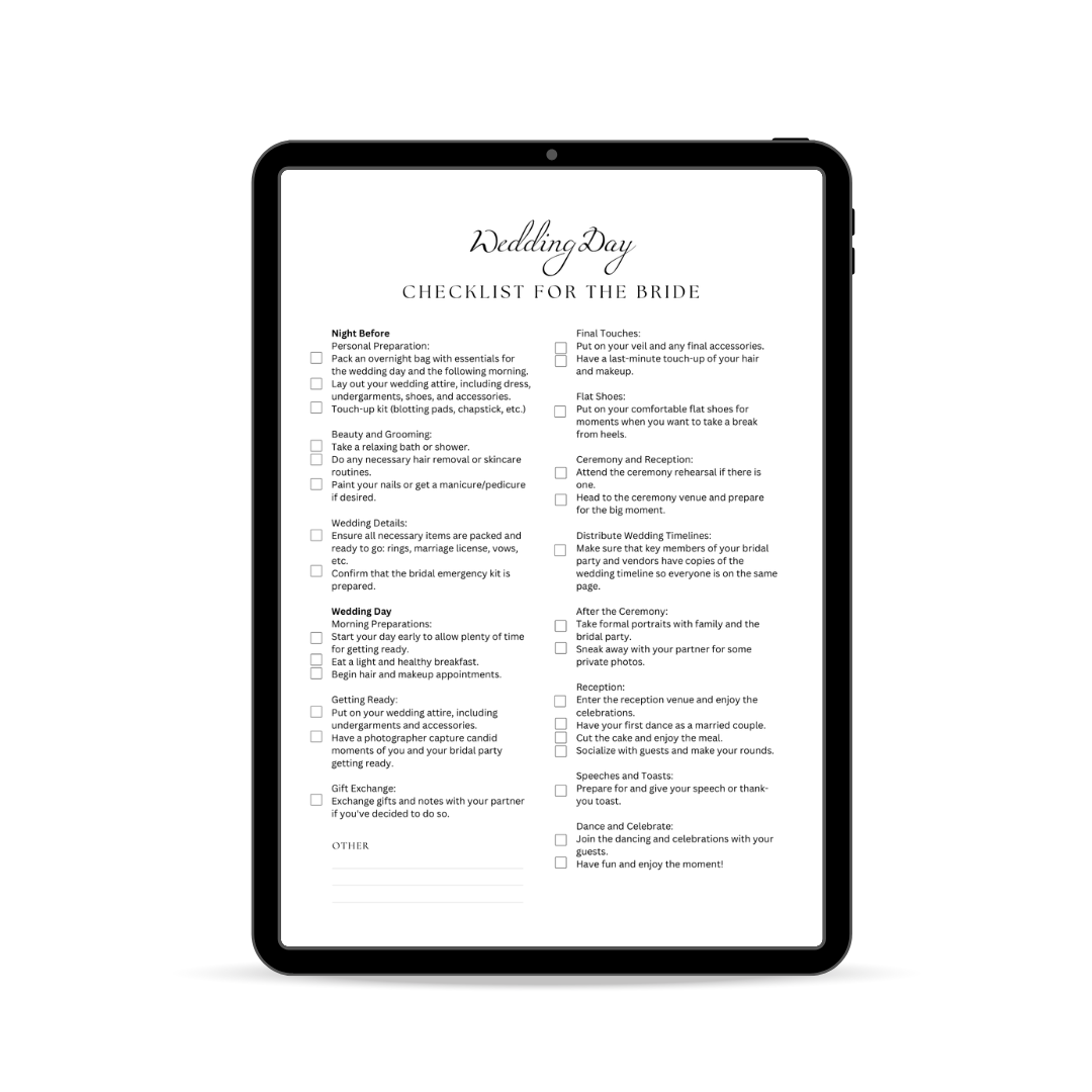 Our Wedding Day Checklist will help you ensure that you’re well-prepared and organized amidst the excitement of the day. Feel free to customize this checklist further to match your specific wedding plans and preferences.